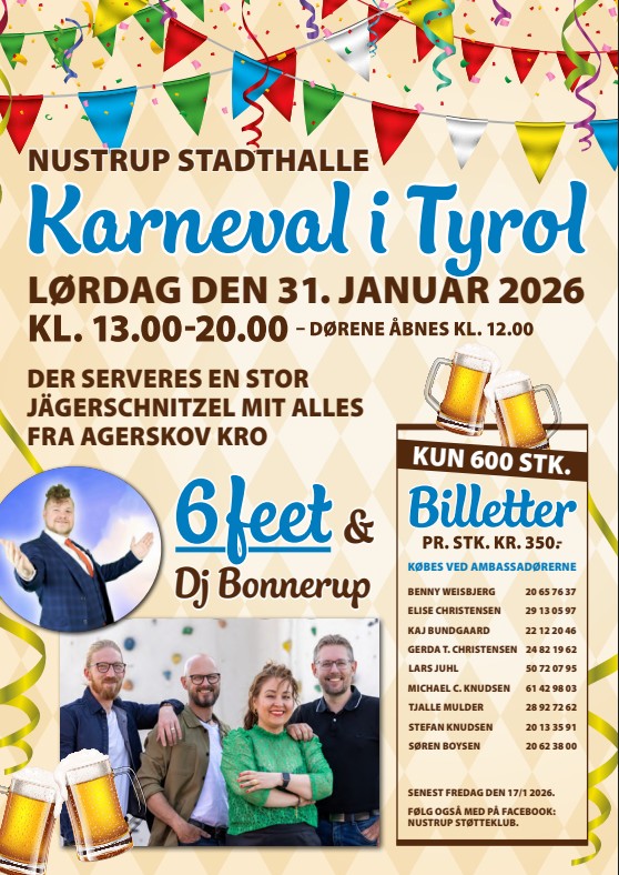 Støtteklubben står også bag ”Karneval i Tyrol”, som samler flere hundrede festligt udklædte mennesker fra byen til fest i Nustrup Hallen eller Nustrup Stadthalle, som den omdøbes til i dagens anledning. Et live band spiller op til fællessang og dans med et stort repertoire af tyske slagere. Menuen er naturligvis ”Jâgerschnitzel mit alles og Grosse øl i 1 liters krus”, serveret af skønne piger i Dirndl og flotte mænd i Lederhosen.